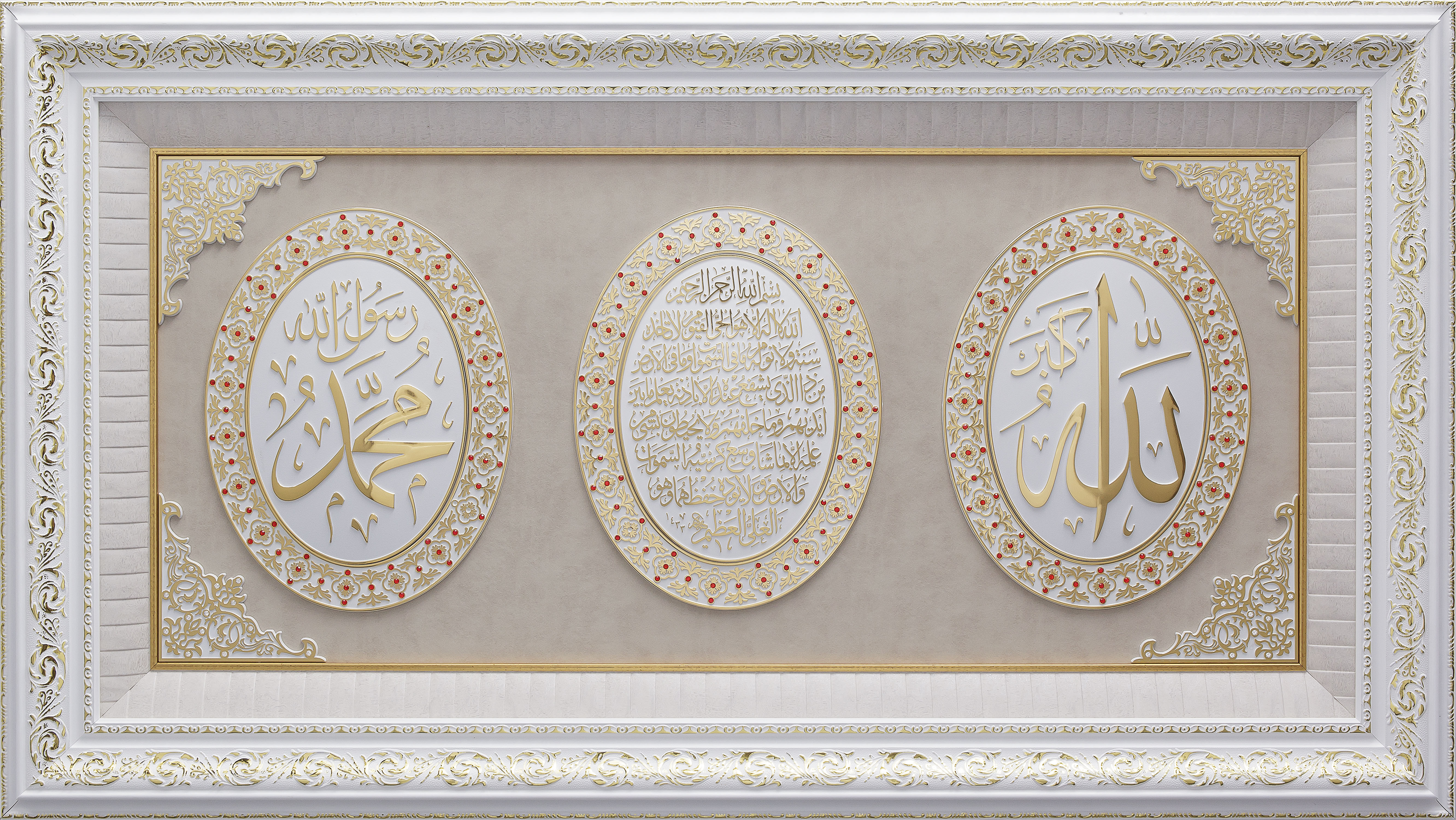 Üçlü Oval Tablalı Az Taşlı İsmi Celil-İsmi Nebi-Ayet-el Kürsi - Beyaz Sarı