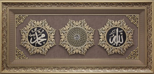 Üçlü 8 Köşeli Ayet Paspartu Taşlı İsmi Celil-İsmi Nebi-Esma - Sarı